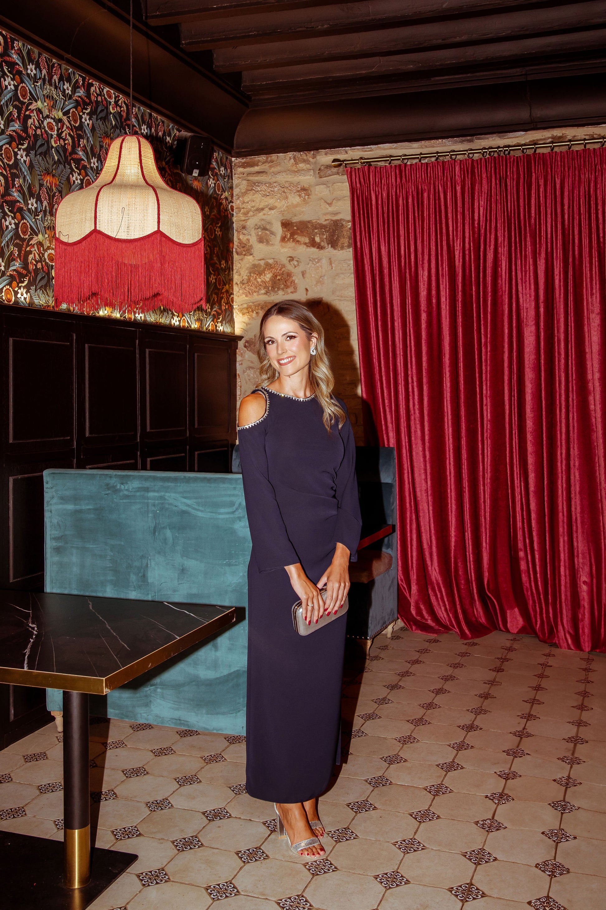 Este vestido de corte midi y recto en azul noche es la definición de elegancia moderna con un giro inesperado.