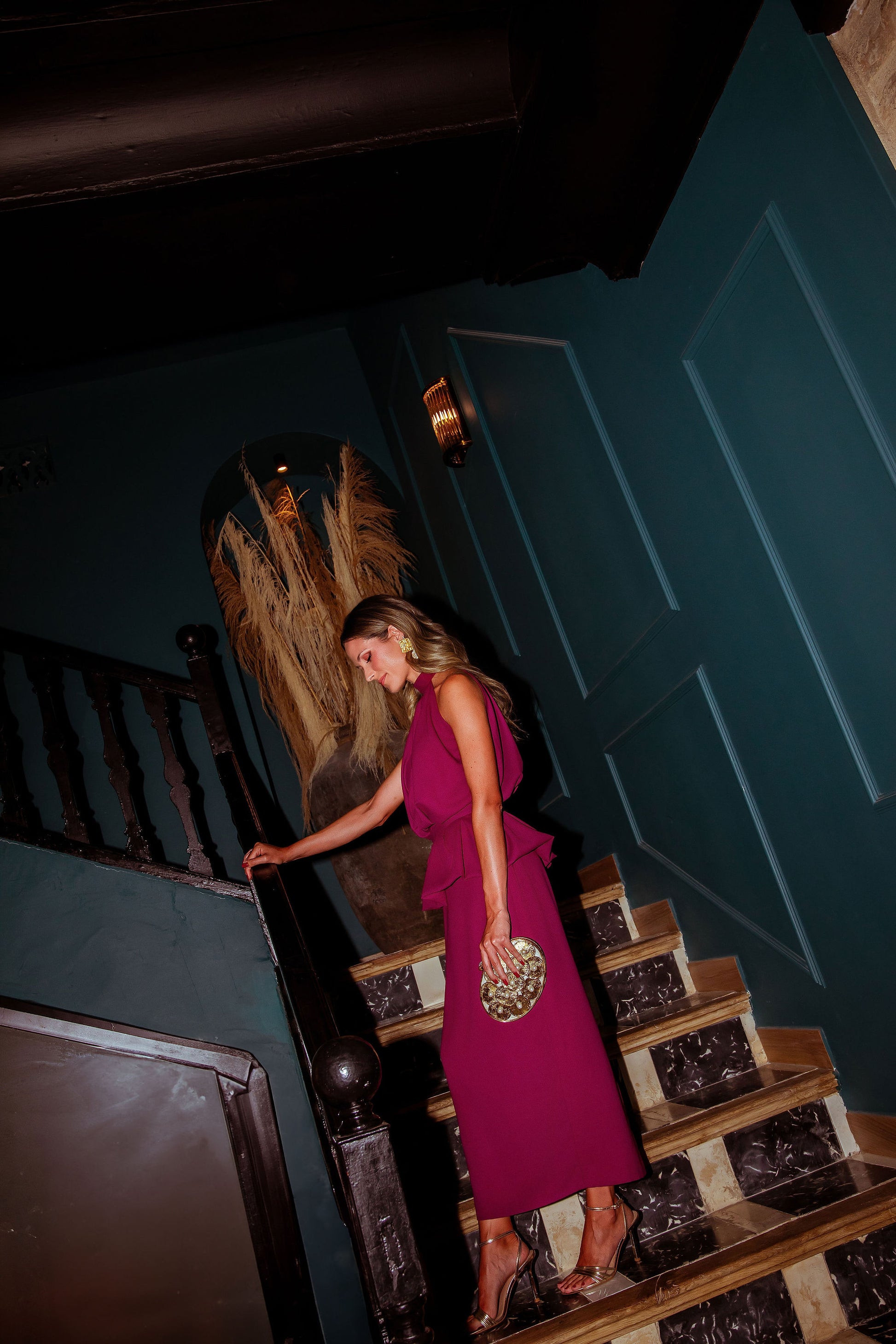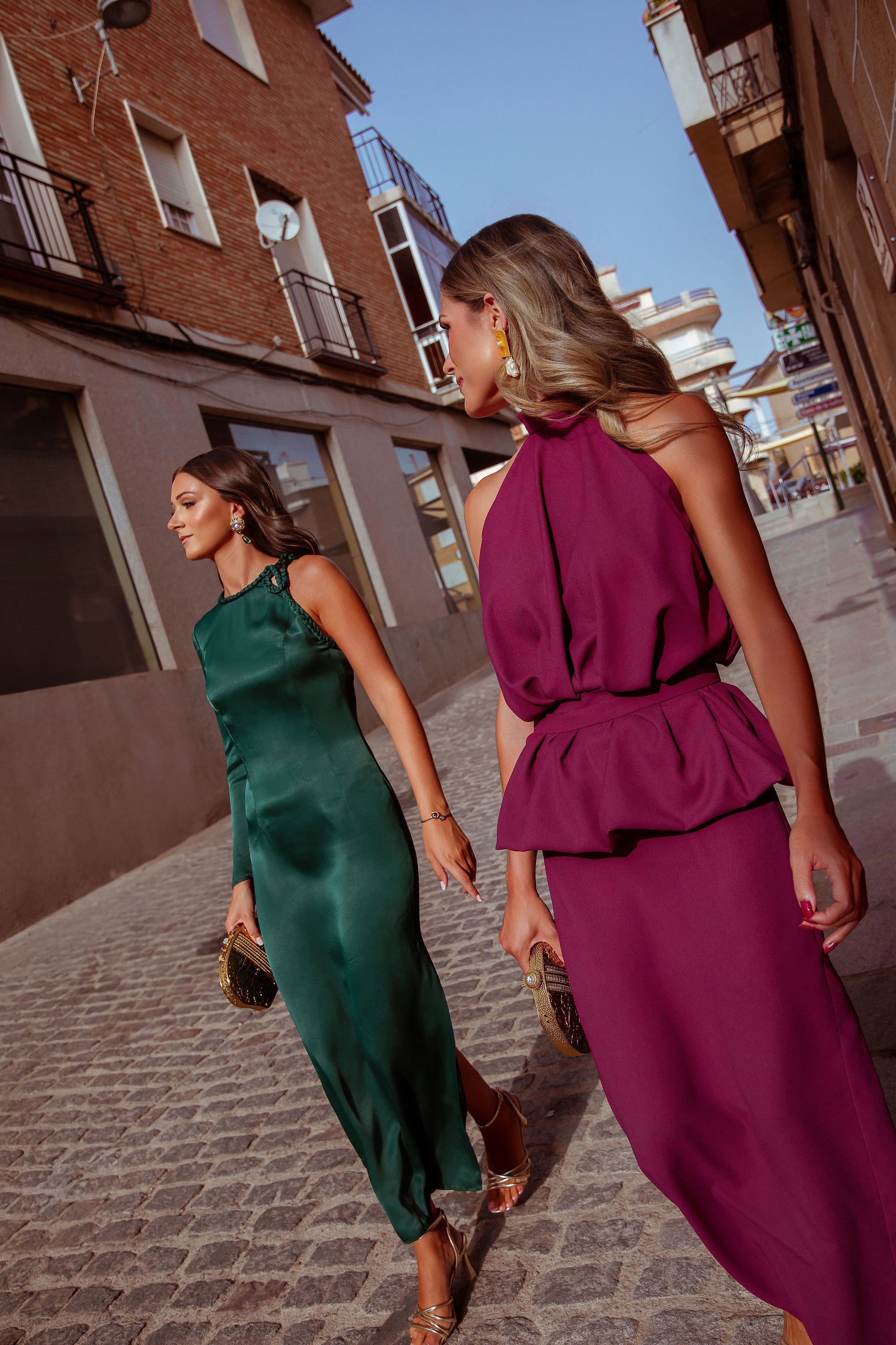 El escote halter realza los hombros y alarga el cuello, aportando un aire sofisticado y femenino. El corte recto y limpio estiliza la figura, mientras que la abertura trasera en la falda aporta comodidad, movimiento y un toque sensual muy favorecedor.